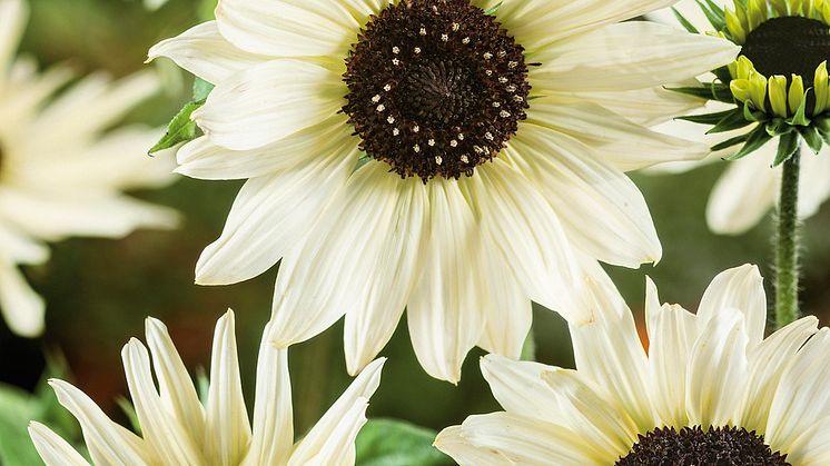 Ovanlig miniatyrsolros med små gräddvita solar mot en kontrasterande, mörk blomdisk. Välförgrenat växtsätt som passar i både utekruka och rabatt