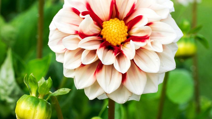 Söt dahlia med tvåfärgade blommor i rött och vitt med solgul disk. Den öppna blomformen uppskattas av våra pollinatörer. Kompakt och låg, perfekt för utekrukan på balkong och uteplats.