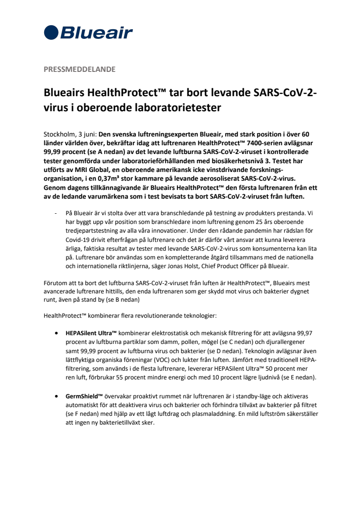 Den svenska luftreningsexperten Blueair, med stark position i över 60 länder världen över, bekräftar idag att luftrenaren HealthProtect™ 7400-serien avlägsnar 99,99 procent av det levande luftburna SARS-CoV-2-viruset i kontrollerade tester genomförda under laboratorieförhållanden med biosäkerhetsnivå 3.