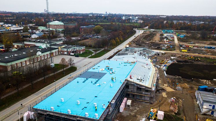Två större takytor á 2000 m2 håller på att läggas på en skola och en gymnastikhall i Lund. Takmontage AB är först ut i Sverige med att lägga det nya tätskiktet Base Syntan. Base Syntan fungerar som undre skikt i ett svetsbart 2-lagssystem av bitumentätskikt där Top SV svetsas ovanpå.