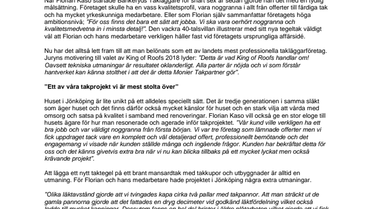 Juryns motivering till valet av King of Roofs 2018 lyder: ”Detta är vad King of Roofs handlar om! Oavsett tekniska utmaningar är resultatet oklanderligt. Alla parter är nöjda och vi som förstår hantverket kan känna stolthet i att det är detta Monier Takpartner gör”.