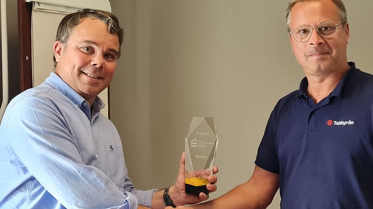 Daniel Driving, VD BMI Sverige AB överräcker statyett till Håkan Jaconelli, VD Takbyrån i Alingsås AB