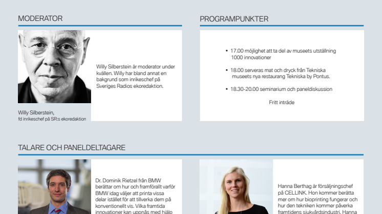 maningarna för de 3D-printade brännare som används kommersiellt i Siemens gasturbiner. Brännarna utsätts för stor belastning i kombination med temperaturer på över 1000°C. En av Siemens största utmaningar är därför att ta tekniken från småskalig produktion till industrialiserad serieproduktion. - Hanna Berthag är försäljningschef på CELLINK. Hon kommer berätta mer om hur bioprinting fungerar och hur den tekniken kommer påverka framtidens sjukvårdsindustri. Hanna har en mastersexamen i "material och nanoteknik" från Chalmers.