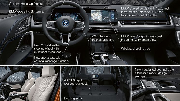 I den upphöjda sittpositionen bakom ratten levereras välbekant och förarorienterad BMW-atmosfär. Den smala instrumentpanelen med BMW Curved Display skiljer sig från den tidigare generationen, där de två informations- och infotainmentskärmarna smälter samman till en enhet. Flera funktioner styrs nu genom skärmens peksystem. En annan nyhet är smartphone-utrymmet i mittkonsolen.