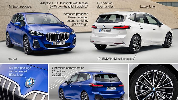 Den andra generationen av denna sportiga allroundare utstrålar dynamik och imponerande närvaro genom BMW:s distinkta formspråk samt uppdaterade interiör, där det nya interaktiva konceptet med BMW Curved Display höjer ribban för denna fordonsklass när det kommer till användarupplevelse. Med sina många användningsområden och breda utbud av standardutrustning är nya BMW 2-serien Active Tourer särskilt attraktiv för kunder med en aktiv livsstil.