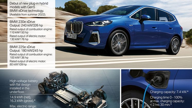 Nya BMW 2-serie Active Tourer erbjuds med två olika plug-in hybrid-varianter: BMW 225e xDrive och BMW 230e xDrive. Båda modellerna är fyrhjulsdrivna och kommer med femte generationen av BMW eDrive-tekniken.