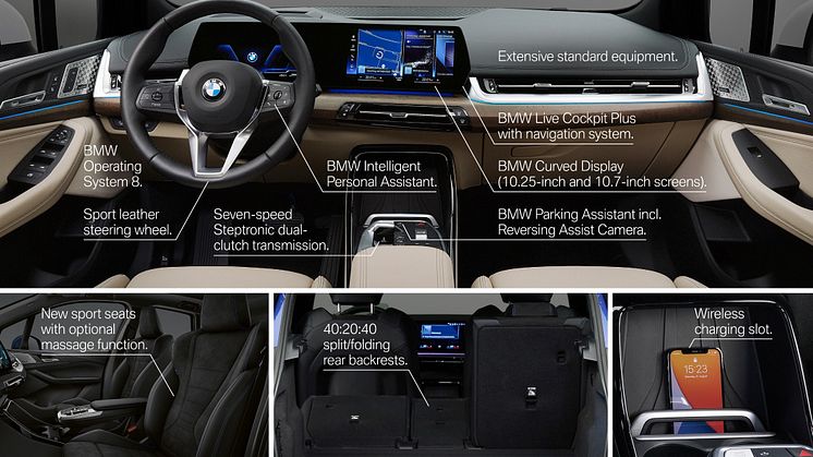 Nya BMW 2-serien Active Tourer har dessutom ett omfattande stadardutbud av funktioner, som inkluderar BMW:s navigationssystem, fyra USB-C-portar och 12V eluttag i både mittkonsolen och bagageutrymmet, intelligent automatisk klimatkontroll, Sportläderratt, regnsensor med vindrutetorkarreglering, automatisk strålkastaraktivering, utökat utbud av förarassistanssystem samt parkeringsassistens med backningskamera.