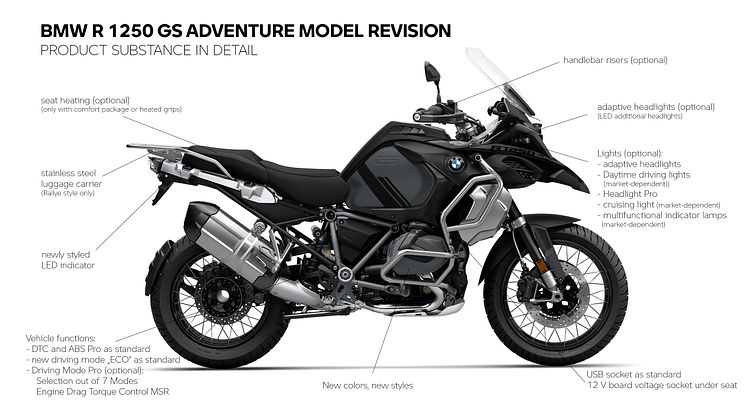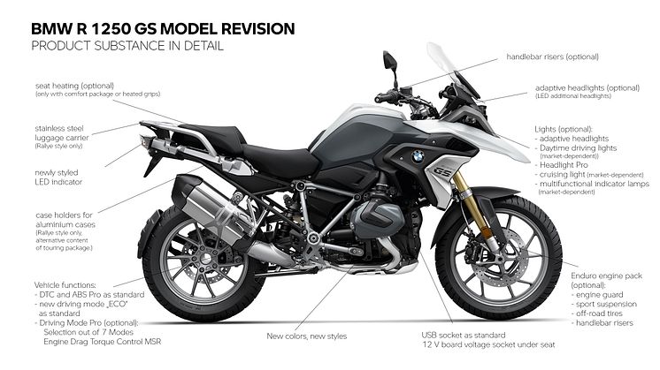 - Connectivity: Multifunktionellt instrumentkluster med 6,5 tum full-colour TFT-display och ett brett utbud av extrafunktioner som standard på R 1250 GS.