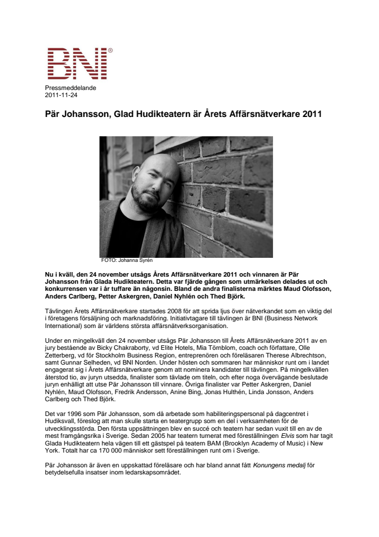 Nu i kväll, den 24 november utsågs Årets Affärsnätverkare 2011 och vinnaren är Pär Johansson från Glada Hudikteatern. Detta var fjärde gången som utmärkelsen delades ut och konkurrensen var i år tuffare än någonsin. Bland de andra finalisterna märktes Maud Olofsson, Anders Carlberg, Petter Askergren, Daniel Nyhlén och Thed Björk.