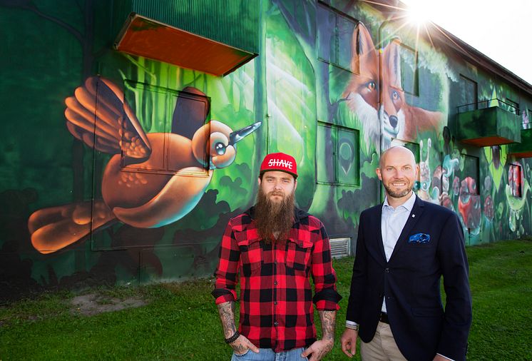 Gatukonstnären och tatueraren Oskar Mannberg och Claes Nordmark, kommunalråd och kommunstyrelsens ordförande i Boden, framför väggmålning på Brogatan 11-13 i Boden.
