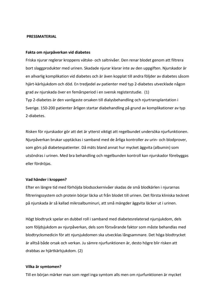 30 - 40 procent av alla patienter med typ 2-diabetes kommer med tiden att drabbas av någon form av njurskada. (3) Nedsatt njurfunktion innebär även en ökad risk för hjärt- kärlsjukdom och död.