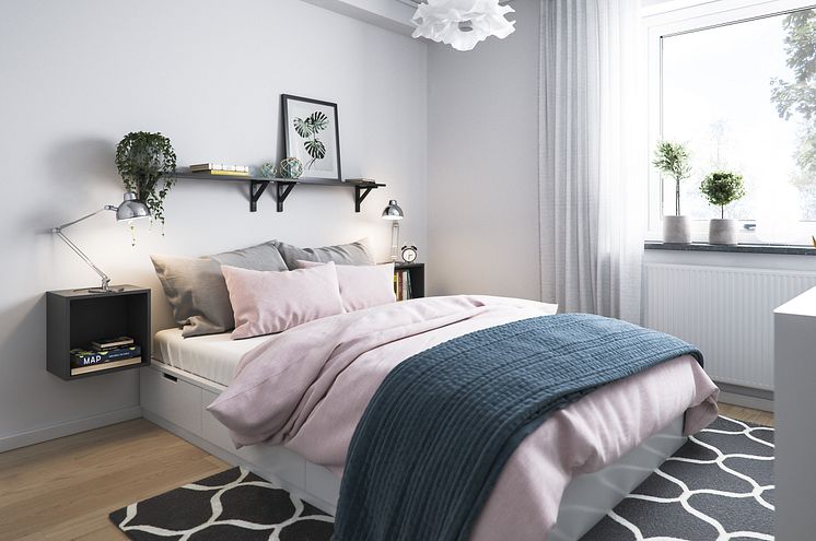 Illustration av sovrum, BoKlok-lägenhet, 2 rok, 2019.