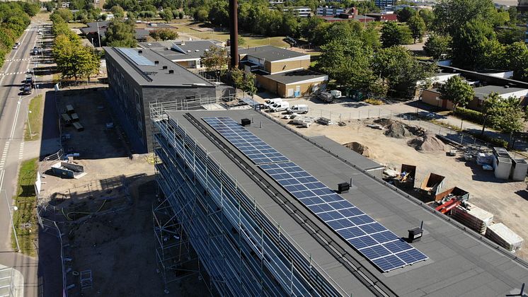De två lägenhetshusen i BoKlok Pilkvisten med solceller på taket, som driver el till byggarbetsplatsen.