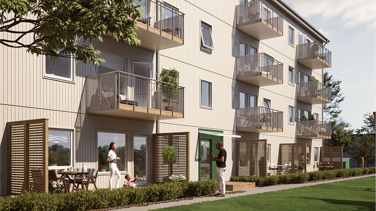 Illustration av altaner och balkonger, BoKlok Rubinen, Bäckby, Västerås.