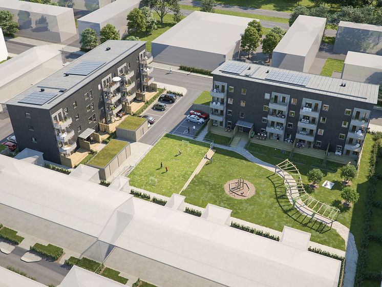 Illustration av de kommande lägenhetshusen i BoKlok Aroma, Drottninghög, Helsingborg. På bilden syns altaner/balkonger och gemensamma grönytor.