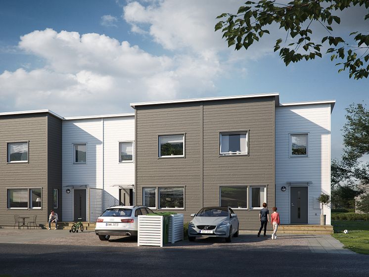 Illustration av entrésida med förstukvist och parkering, BoKlok Kajen i Ängelholm.