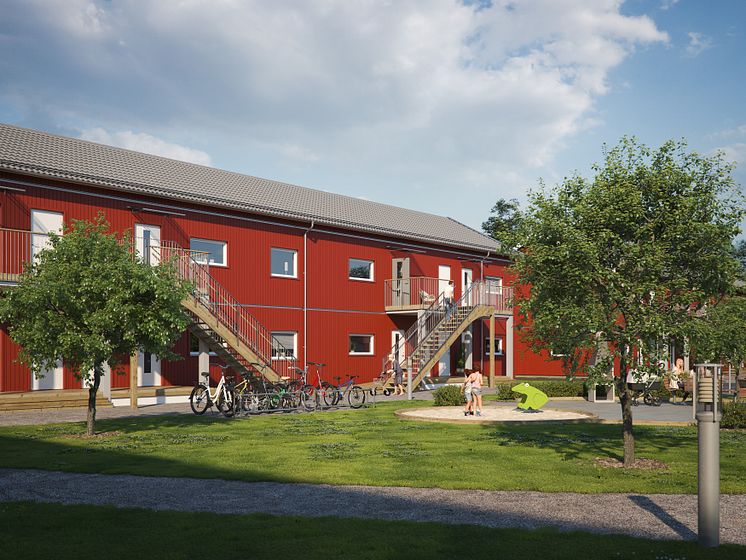 Illustration av entrésida med gemensam grönyta och lekplats, BoKlok Mellstagården i Borlänge.