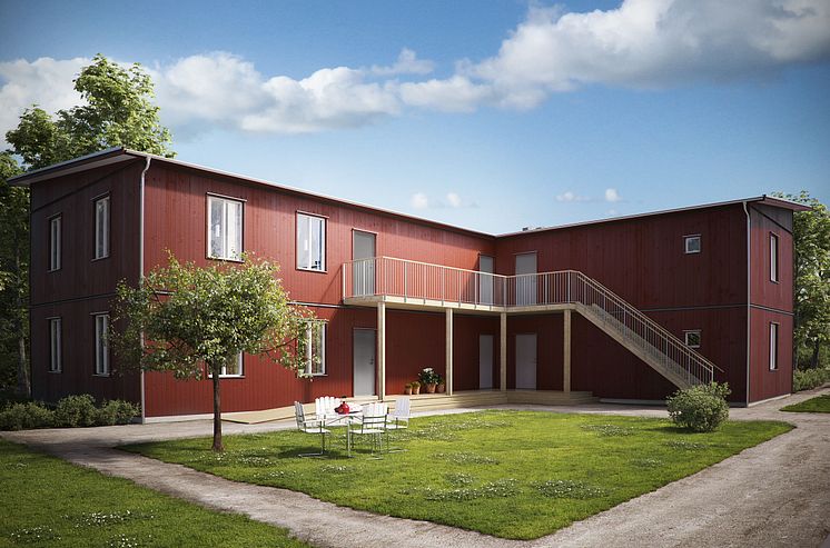 Illustration av entrésida med gemensam uteplats. Huset på bilden är inte det som ska byggas i BoKlok Droskan men är av samma hustyp. Avvikelser kan därför förekomma.