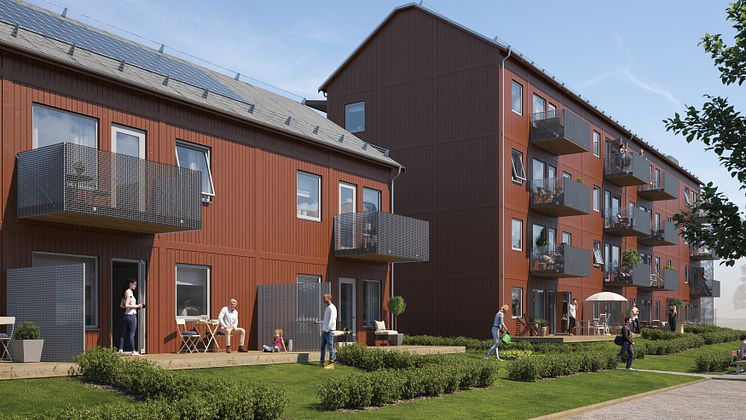 Illustration av gårdssida med altaner & balkonger, BoKlok Amazonen, Falun.