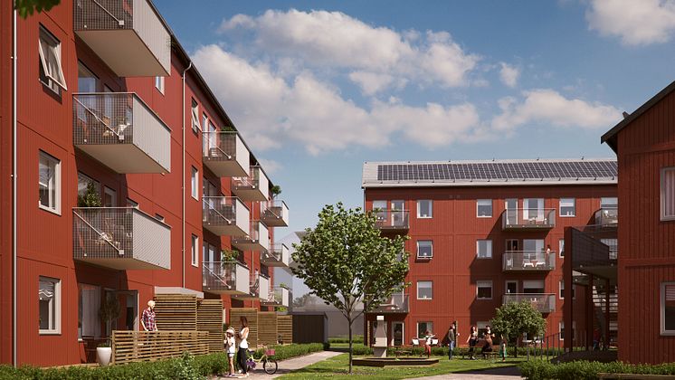 Illustration av gårdssida, med gröna gemensamhetsytor, BoKlok Silvermalmen i Sala.