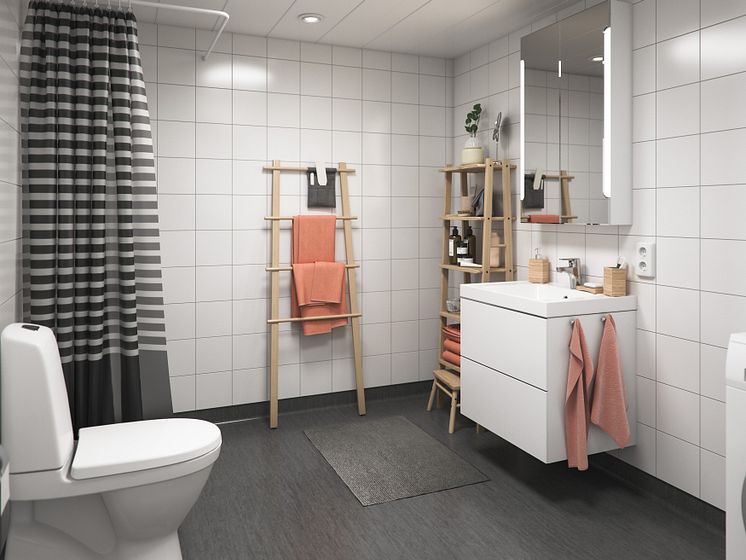 Illustration av interiör, badrum BoKlok-lägenhet 2 rok, 2019.