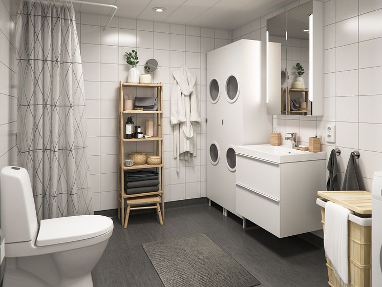 Illustration av interiör, badrum, BoKlok-lägenhet 4 rok, 2020.