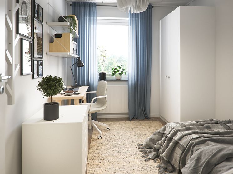 Illustration av interiör, gästrum/kontor, BoKlok-lägenhet 4 rok, 2021.