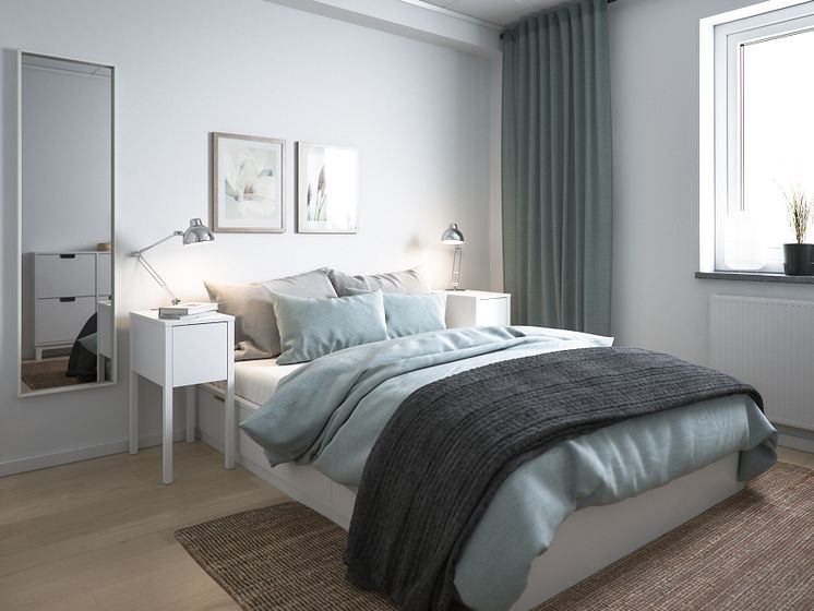 Illustration av interiör, sovrum, BoKlok-lägenhet 4 rok, 2019.