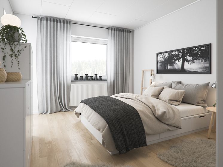 Illustration av interiör, sovrum, BoKlok småhus 2019.