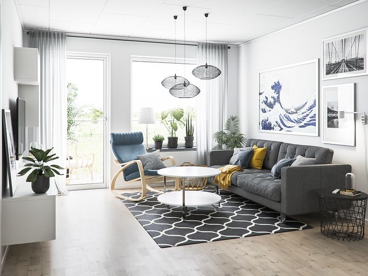 Illustration av interiör, vardagsrum, BoKlok-lägenhet 3 rok, 2021.
