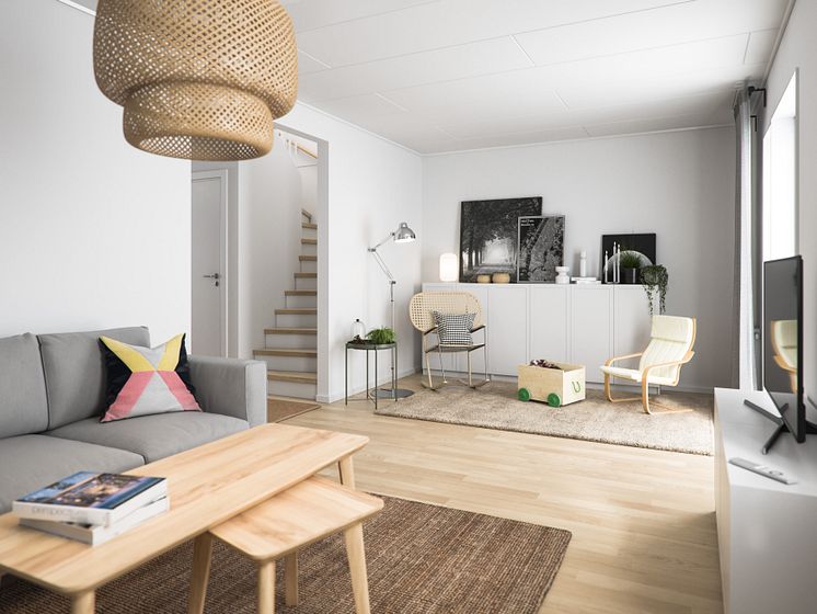 Illustration av interiör vardagsrum, BoKlok småhus 2019.