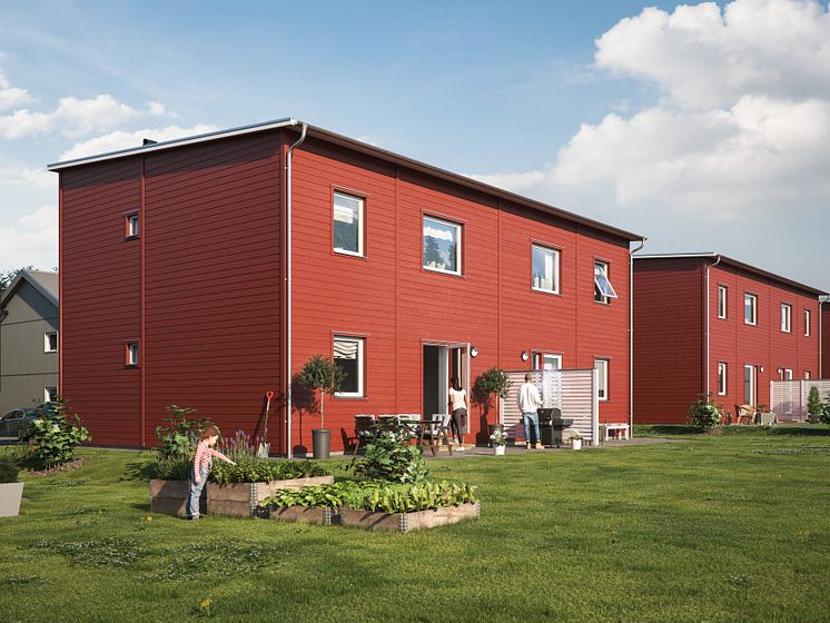 Illustration av trädgårdssida med gräsmatta och uteplats, parhusen i BoKlok Biodlaren, Göta, Lilla Edet.