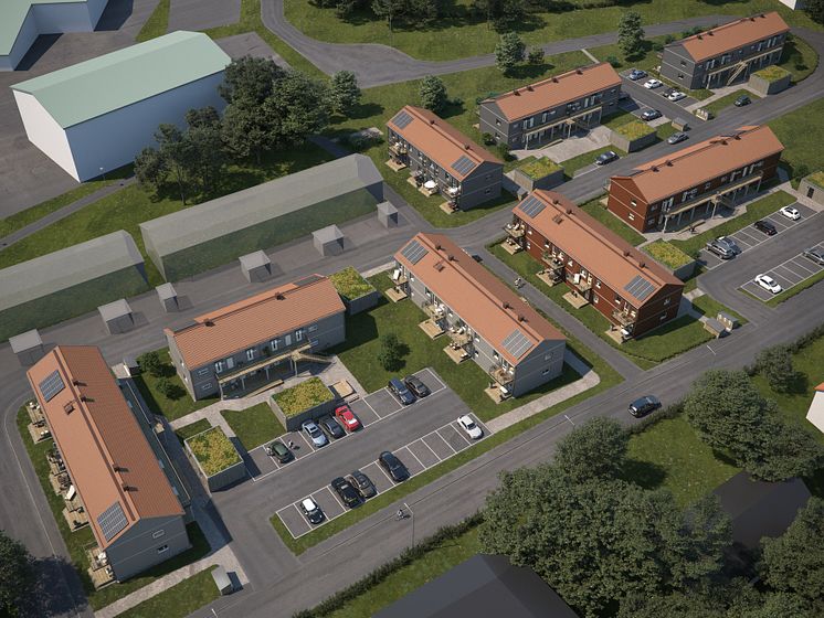 Översiktsillustration av det nya kvarteret BoKlok Krysset i Bålsta.