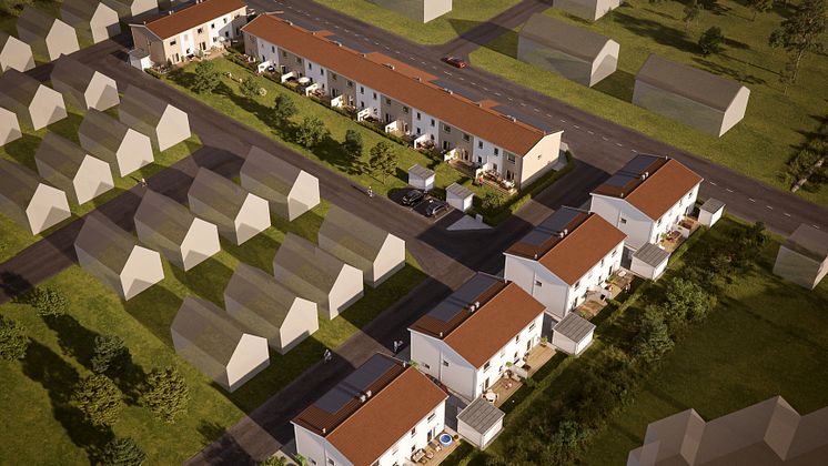 Översiktsillustration av det nya kvarteret BoKlok Lyckotäppen, Viken. På bilden syns också övrig kommande bebyggelse i området.