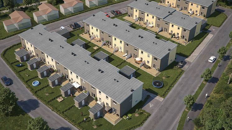Översiktsillustration av det nya kvarteret BoKlok Magasinet i Hässleholm.