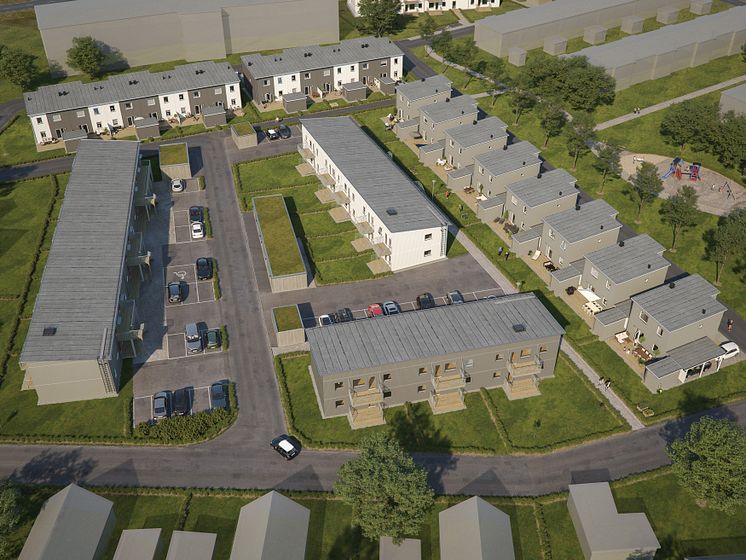 Översiktsillustration av det nya området BoKlok Kajen i Ängelholm, med radhus & kedjehus.