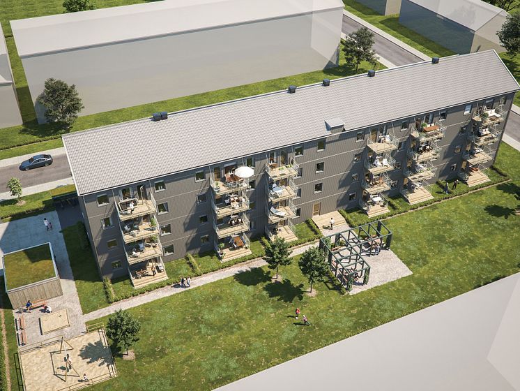 Översiktsillustration över BoKlok Landeriet, med gemensam uteplats, grönytor och lekplats.