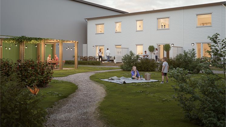 - Vi har arbetat fram den gemensamma innergården utefter visionen att ha en lummig och grönskande yta för de boende att träffas och umgås på. Här finns till exempel bärbuskar att njuta av på sommaren, samt en pergola och en grillplats för grannar att samlas vid. Vid de två entréerna finns grindar som skapar en tydlig inramning av kvarteret och trygghet för de boende, säger Helena Wilroth.