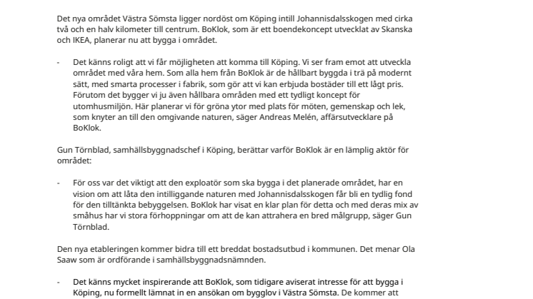 - Det känns roligt att vi får möjligheten att komma till Köping. Vi ser fram emot att utveckla området med våra hem. Som alla hem från BoKlok är de hållbart byggda i trä på modernt sätt, med smarta processer i fabrik, som gör att vi kan erbjuda bostäder till ett lågt pris. Förutom det bygger vi ju även hållbara områden med ett tydligt koncept för utomhusmiljön. Här planerar vi för gröna ytor med plats för möten, gemenskap och lek, som knyter an till den omgivande naturen, säger Andreas Melén, affärsutvecklare på BoKlok.