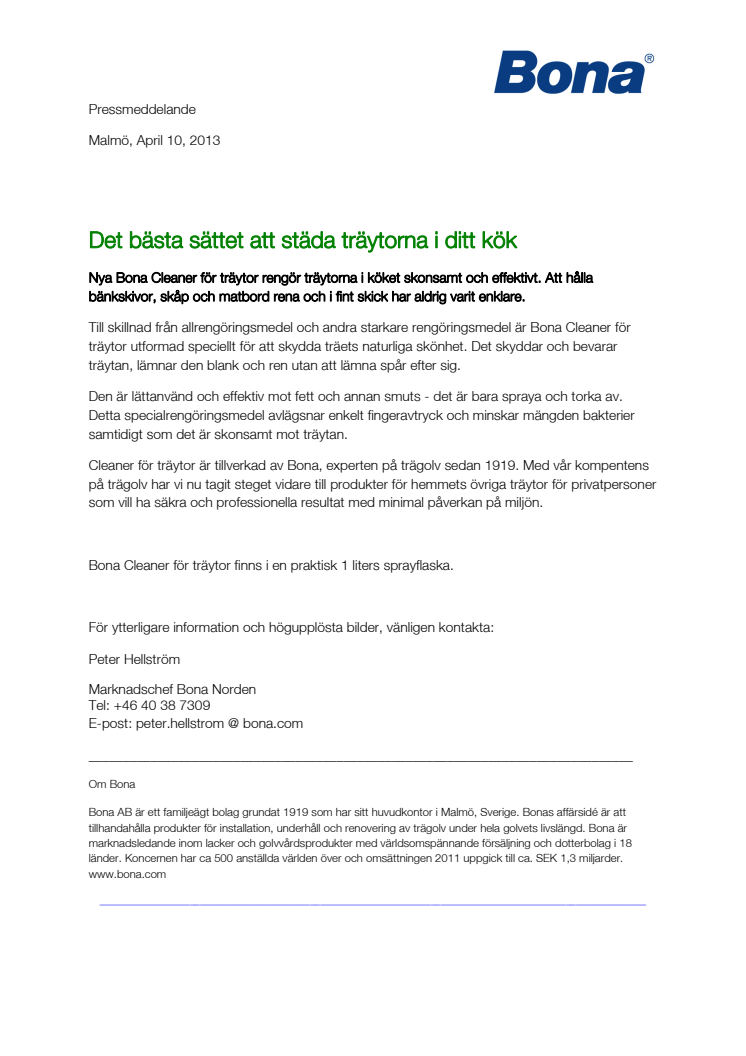 Nya Bona Cleaner för träytor, rengör träytorna i köket skonsamt och effektivt. Att hålla bänkskivor, skåp och matbord rena och i fint skick har aldrig varit enklare.
