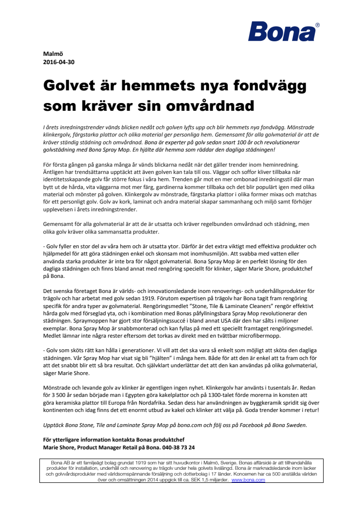 I årets inredningstrender vänds blicken nedåt och golven lyfts upp och blir hemmets nya fondvägg. Mönstrade klinkergolv, färgstarka plattor och olika material ger personliga hem. Gemensamt för alla golvmaterial är att de kräver ständig städning och omvårdnad. Bona är experter på golv sedan snart 100 år och revolutionerar golvstädning med Bona Spray Mop. En hjälte som räddar den dagliga städningen!