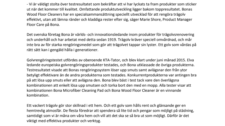 Golvrengöringstestet utfördes av oberoende KTA-Tator, och blev klart under juni månad 2015. Elva ledande europeiska golvrengöringsprodukter testades, och Bona utklassade de övriga produkterna. Testresultatet visade att Bonas rengöringssystem löser upp smuts samt avlägsnar den från ytor betyligt effektivare än de andra produkterna som testades. Konkurrentprodukterna var antingen bra på att lösa upp smuts eller att avlägsna den. Bona blev bäst i test tack vare den överlägsna kombinationen att enkelt lösa upp smutsen och torka bort den med en mopp. Alla tester visar att kombinationen Bona Microfiber Cleaning Pad och Bona Wood Floor Cleaner är en vinnande kombination.