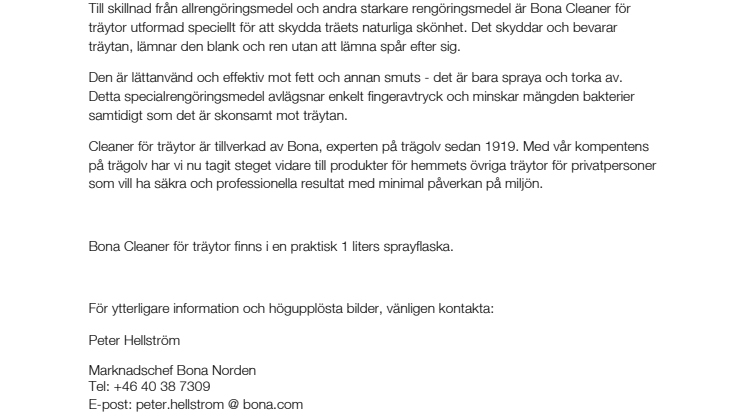 Cleaner för träytor är tillverkad av Bona, experten på trägolv sedan 1919. Med vår kompentens på trägolv har vi nu tagit steget vidare till produkter för hemmets övriga träytor för privatpersoner som vill ha säkra och professionella resultat med minimal påverkan på miljön.