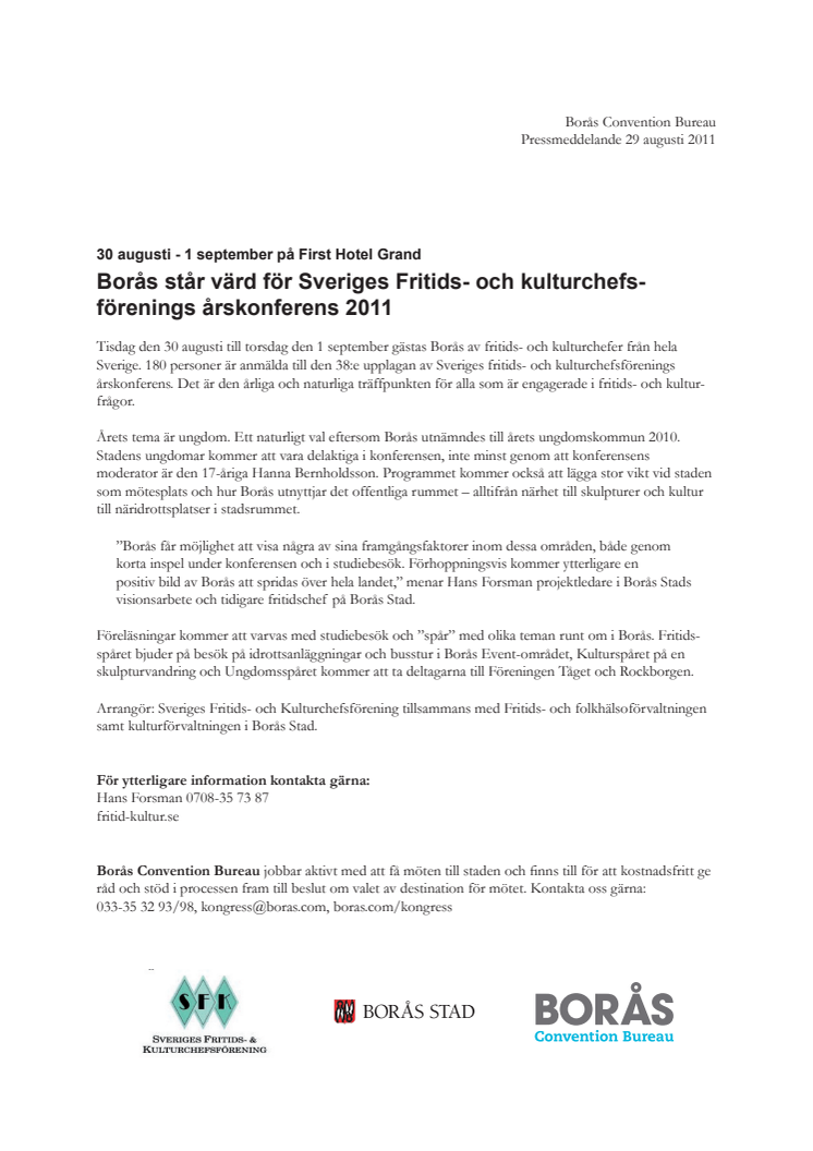 - Vi kommer att bjuda på spännande föreläsare som ligger i framkant när det gäller kultur och fritid. Borås får möjlighet att visa några av sina framgångsfaktorer inom dessa områden, både genom korta inspel under konferensen och i studiebesök. Stadens duktiga ungdomar kommer att vara i högsta grad delaktiga i konferensen, inte minst genom att hela konferensens moderator är den 17-åriga Hanna Bernholdsson. Förhoppningsvis kommer ytterligare en positiv bild av Borås att spridas över hela landet, menar Hans Forsman projektledare i Borås Stads visionsarbete och före detta fritidschef på Borås Stad.
