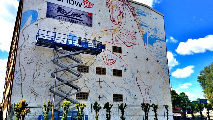 Inför No Limit Street Art Borås i september utförs nu ytterligare en målning. Den här gången handlar det om en riktigt stor vägg på hela 23 meters höjd. Konstnären och No Limits curator Shai Dahan har precis färdigställt skissen på väggen och påbörjat det riktiga målningsarbetet.