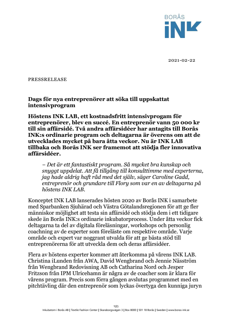 Höstens INK LAB, ett kostnadsfritt intensivprogam för entreprenörer, blev en succé. En entreprenör vann 50 000 kr till sin affärsidé. Två andra affärsidéer har antagits till Borås INK:s ordinarie program och deltagarna är överens om att de utvecklades mycket på bara åtta veckor. Nu är INK LAB tillbaka och Borås INK ser framemot att stödja fler innovativa affärsidéer.