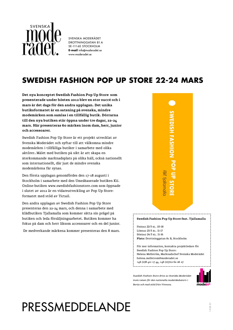 Modeinkubatorn i samarbete med Svenska Moderådet öppnar årets Pop Up Store i Stockholm igen. Det nya konceptet Swedish Fashion Pop Up Store som presenterade under hösten 2012 blev en stor succé och i nästa vecka är det dags för den andra upplagan.
