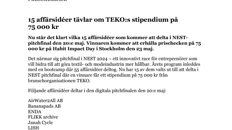 Det närmar sig pitchfinal i NEST 2024 – ett innovativt race för entreprenörer som vill bidra till att göra textil- och modeindustrin mer hållbar. Årets program inleddes med en bootcamp där 55 affärsidéer deltog. Nu har 15 av dem valts ut till att delta i NEST pitchfinal där en vinnare får ett stipendium på 75 000 kr från branschorganisationen TEKO.