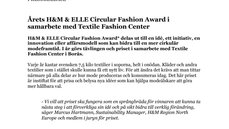 H&M & ELLE Circular Fashion Award* delas ut till en idé, ett initiativ, en innovation eller affärsmodell som kan bidra till en mer cirkulär modeframtid. I år görs tävlingen och priset i samarbete med Textile Fashion Center i Borås.