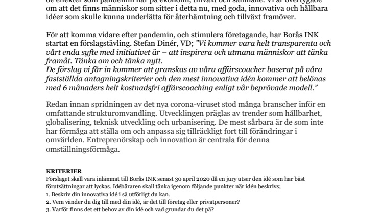 För att komma vidare efter pandemin, och stimulera företagande, har Borås INK startat en förslagstävling. Stefan Dinér, VD; ”Vi kommer vara helt transparenta och vårt enda syfte med initiativet är – att inspirera och utmana människor att tänka framåt. Tänka om och tänka nytt."